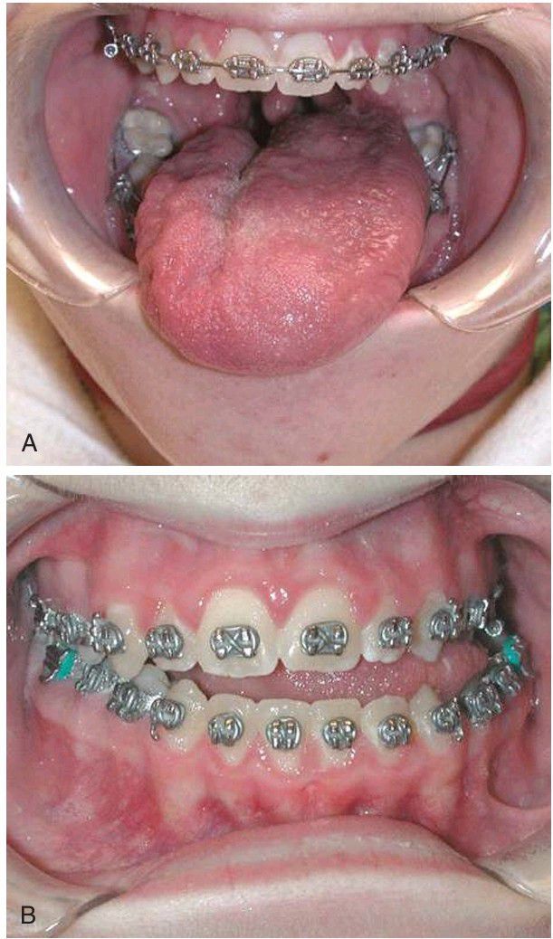 A) Tongue asymmetry with unilateral hypertrophy. (B) Resulting unilateral open bite.