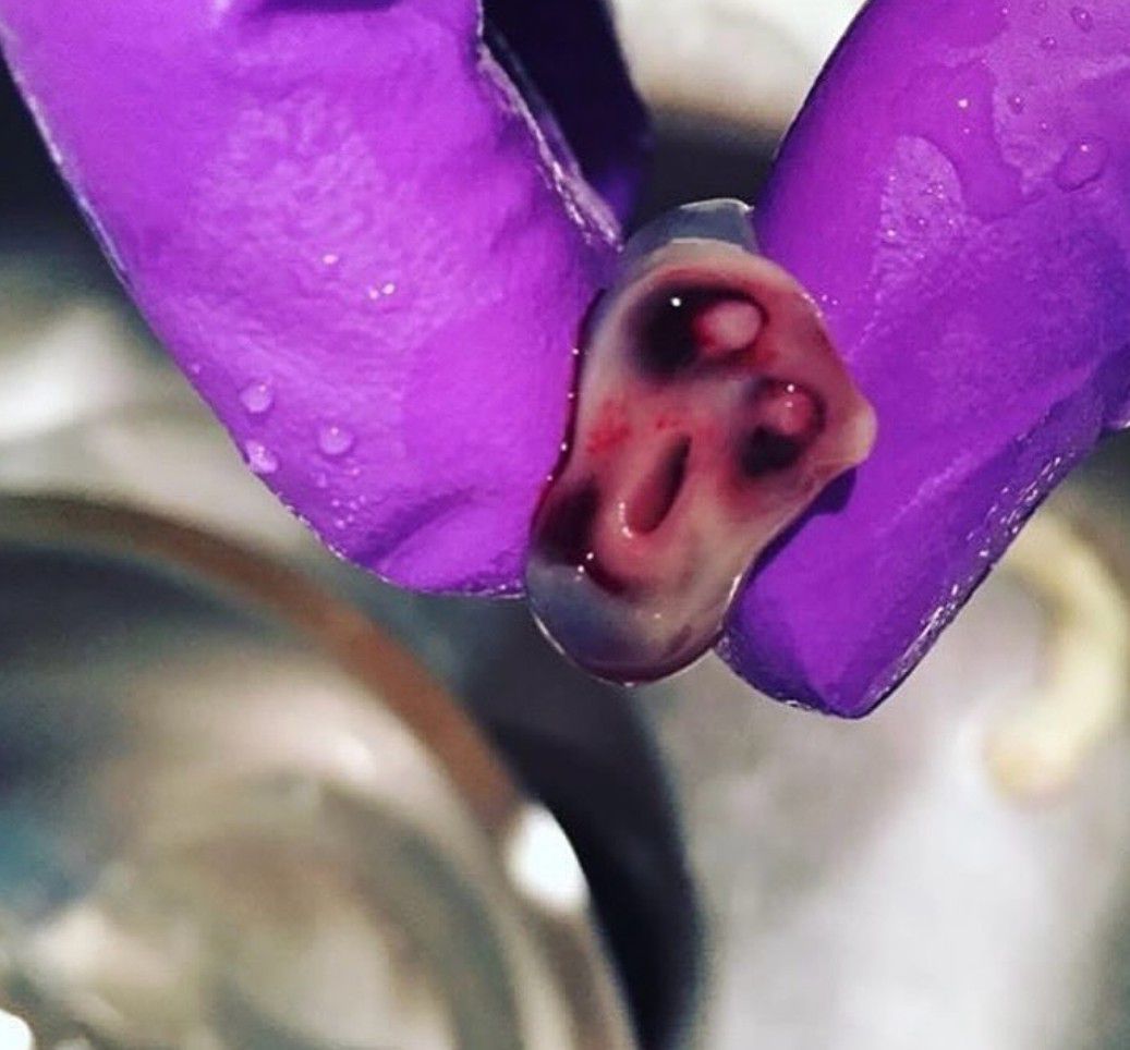 This image shows a cross-section of an umbilical cord, where two arteries and one vein create a face-like appearance—the arteries resemble eyes, and the vein looks like a mouth. The umbilical cord is a vital connection between the fetus and placenta, delivering oxygen, nutrients, and removing waste. The two smaller arteries carry deoxygenated blood to the placenta, while the larger vein brings oxygen-rich blood back to the fetus.