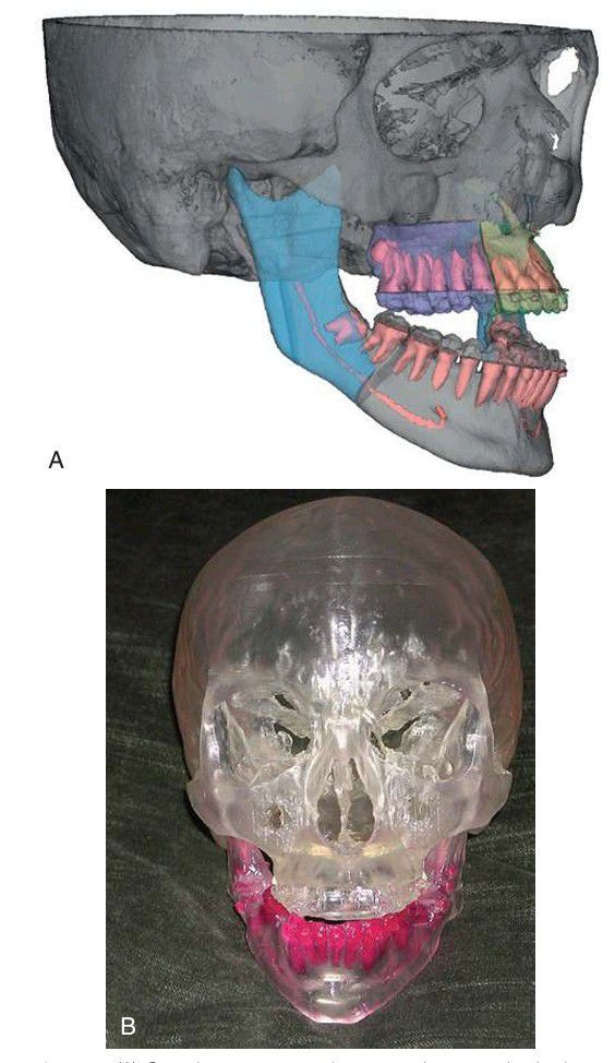 (A) Cone-beam computed tomography scan clearly demonstrating bone deformity in three dimensions with detailed view of skeletal components, tooth root positioning, and location of the inferior alveolar nerve. (B) Stereolithographic model.