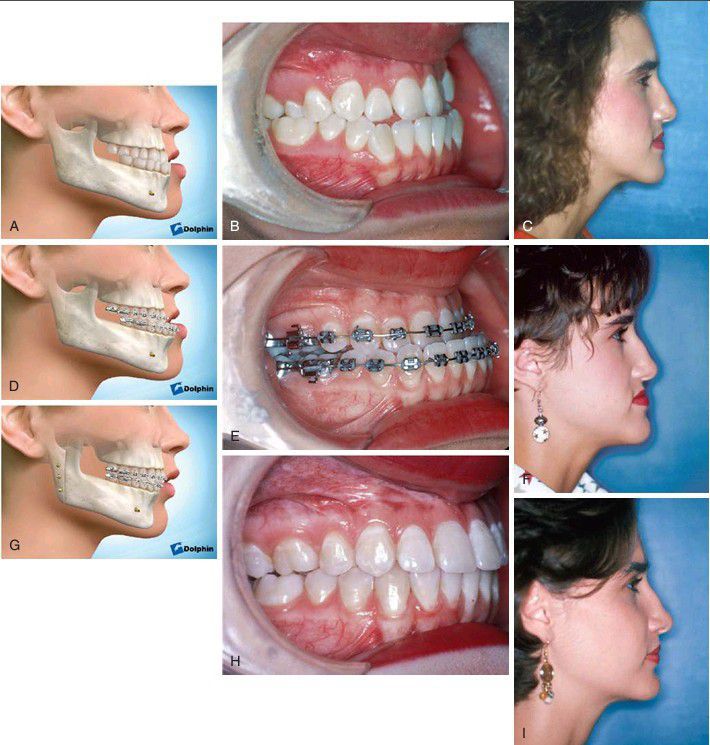 (A) Class III skeletal malocclusion with maxillary deficiency and mandibular excess. (B) Dental compensation includes retroclined lower incisors and proclined upper incisors. (C) Facial profile. (D) After initial orthodontic treatment before surgery. (E) Dental compensations are removed with proclination of the lower incisors and retroclination of the upper incisors, which obviously increases the severity of malocclusion and facial discrepancy. (F) Facial profile at this stage. (G) Surgical correction with posterior positioning of mandible and advancement of maxilla. (H) Ideal occlusion. (I) Facial profile after treatment is complete.