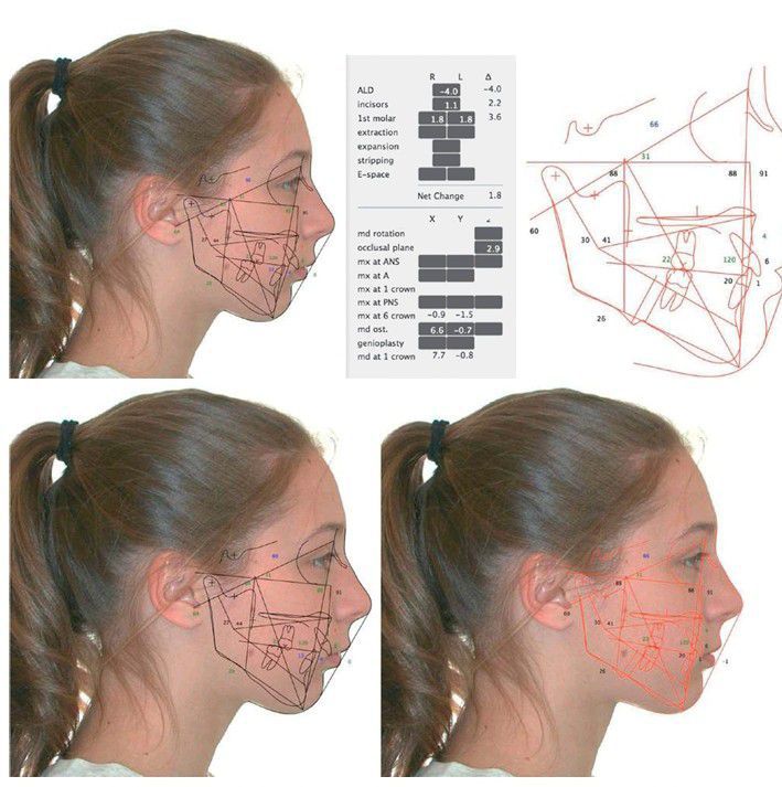 . A digital image is obtained and placed in the computer’s memory. Landmarks from cephalometric tracing are superimposed over the digital image of the face. (A) Portions of cephalometric tracing can be moved to duplicate the anticipated surgical movements. The computer then manipulates the image to depict soft tissue changes. Digital images displayed on the computer monitor show predicted facial changes. (B) Presurgical and estimated final images that would result from anticipated surgical procedure (in this case, maxillary superior repositioning and chin advancement). (Courtesy Quick Ceph Systems, Inc., San Diego, CA.)
