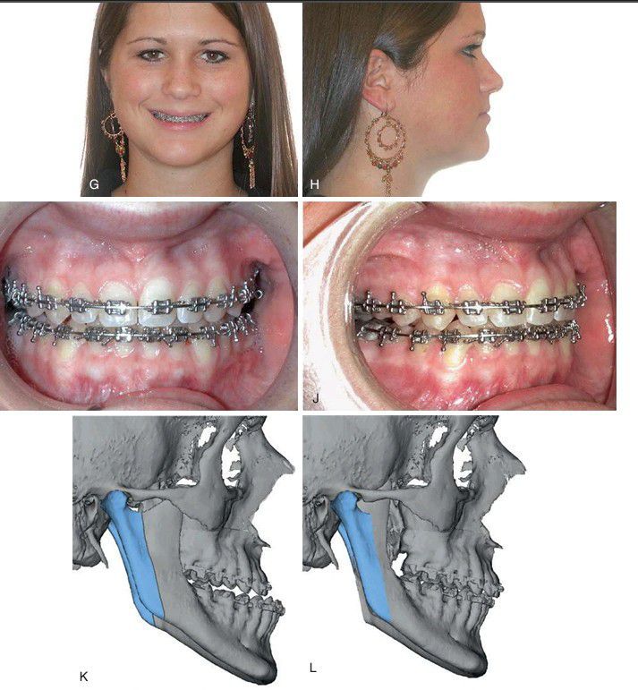 (G–H) Postoperative frontal and profile view of patient seen in (A) and (B). (I–J) Postoperative occlusion seen in (C) and (D). (K–L) Preoperative and postoperative radiographs.
