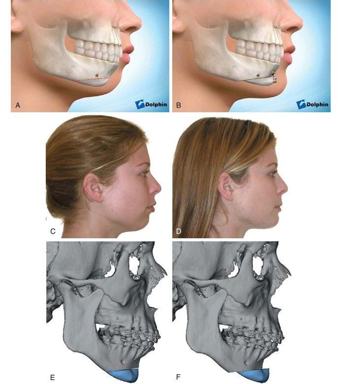 . (A) Advancement of the inferior border of the mandible to increase chin projection. (B) Implant used to augment the anterior portion of the chin, eliminating the need for osteotomy in this area. (C) Clinical image demonstrating chin deficiency. (D) Postoperative image after advancement of the inferior portion of the anterior mandible. (E) Preoperative radiograph. (F) Postoperative radiograph.