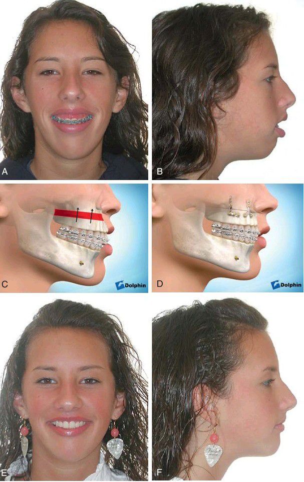 (A–B) Full-face and profile views demonstrating elongation of lower third of face, lip incompetence, and excessive gingival exposure. (C–D) Total maxillary osteotomy with superior repositioning combined with advancement genioplasty. (E–F) Postoperative full-face and profile views after total maxillary osteotomy with superior repositioning and chin advancement.