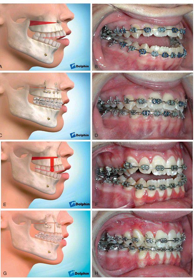 (A-D): Anterior open bite caused by vertical maxillary excess with a flat occlusal plane. Treated by moving the entire maxilla upward (one-piece surgery), resulting in improved occlusion. (E-H): Open bite with uneven maxillary occlusal planes. Treated by segmental maxillary surgery to align segments on the same plane and close the bite, leading to better esthetics.