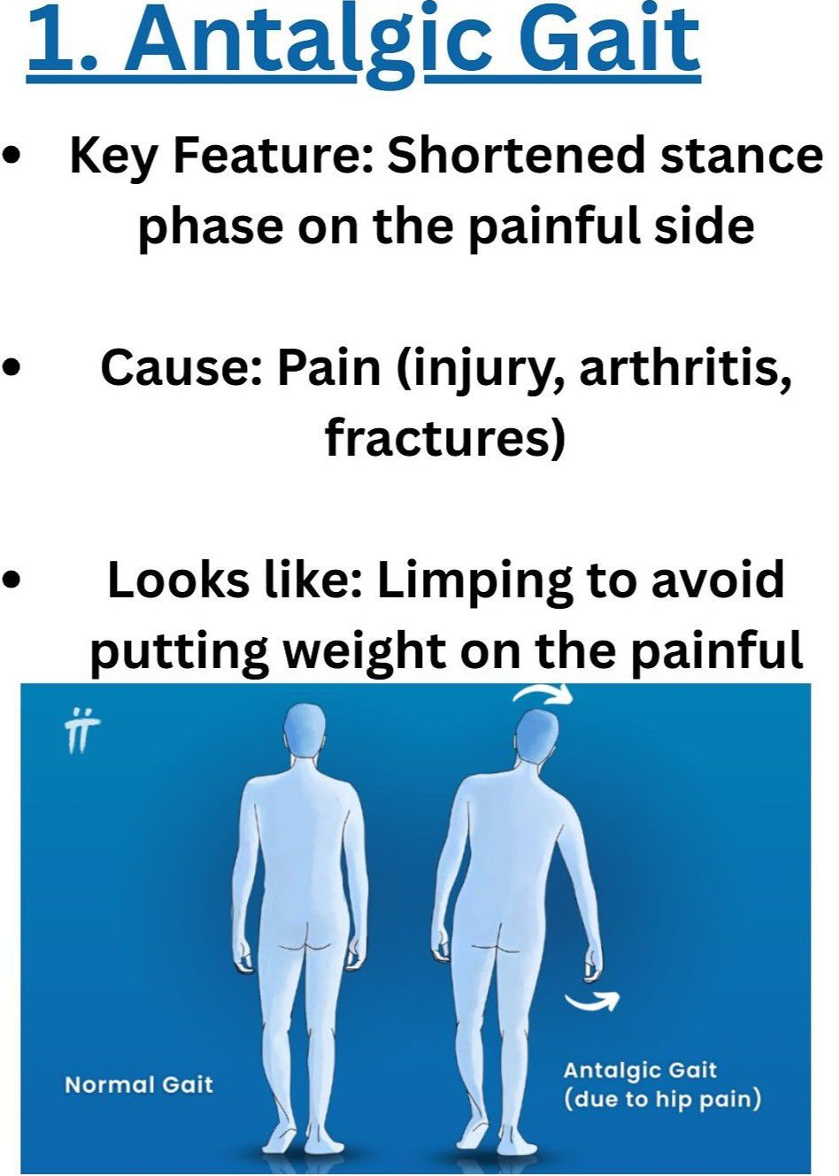 An antalgic gait is a gait that develops as a way to avoid pain while walking. It is a form of gait abnormality where the stance phase of gait is abnormally shortened relative to the swing phase. It is a good indication of weight-bearing pain.