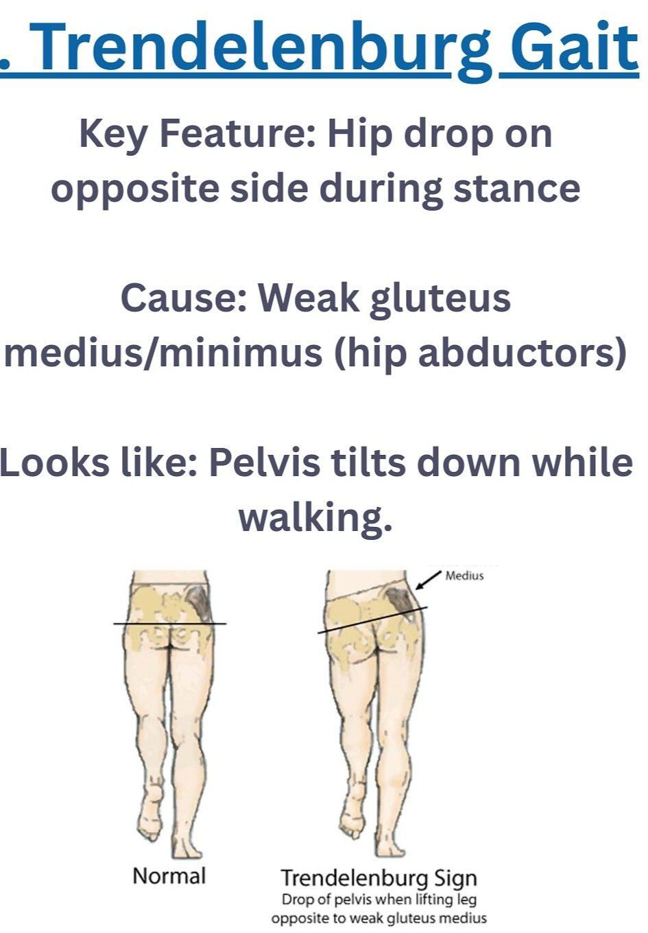 Trendelenburg gait is an abnormal walking pattern characterized by a drop in the pelvis on the side opposite the weak hip abductor muscles. This occurs because the muscles responsible for stabilizing the pelvis while standing on one leg (gluteus medius and minimus) are weak or ineffective. The person compensates by tilting their trunk away from the affected hip to maintain balance.