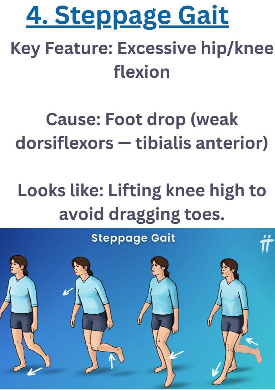 Steppage gait is a form of gait abnormality characterised by foot drop or ankle equinus due to loss of dorsiflexion. The foot hangs with the toes pointing down, causing the toes to scrape the ground while walking, requiring someone to lift the leg higher than normal when walking.