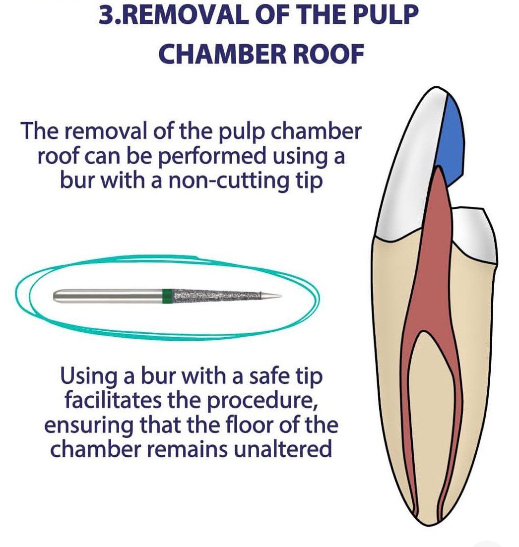 Steps of access opening include: To remove all caries. To conserve sound tooth structure. To completely unroof the pulp chamber. To remove all coronal pulp tissue (vital or necrotic) To locate all root canal orifices. To achieve straight- or direct-line access to the apical foramen or to the initial curvature of the canal.