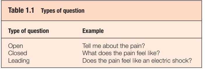 Initial questions should allow patients to speak at some length and to gain confi dence. It is usually best to start with an ‘open’ question.