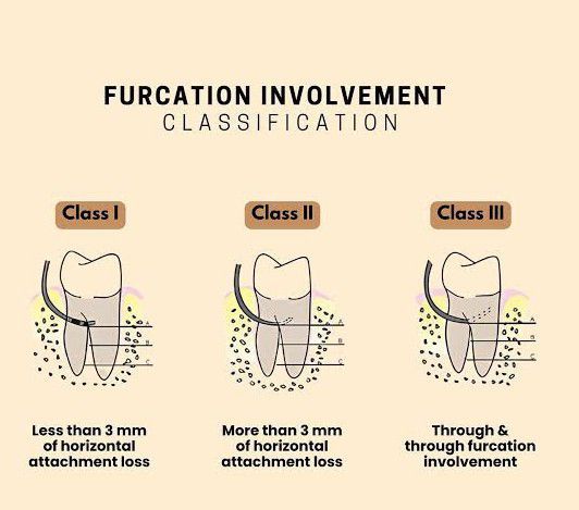 Furcation involvement is classified as grade I subclasses A, B, and C (vertical involvement): Subclass A: Vertical destruction > 1/3. Subclass B: Vertical destruction of 2/3. Subclass C: Vertical destruction beyond apical third of interradicular height.