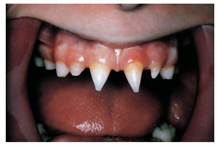 Anhidrotic ectodermal dysplasia showing conical teeth, giving an undesirable, Dracula-like appearance.