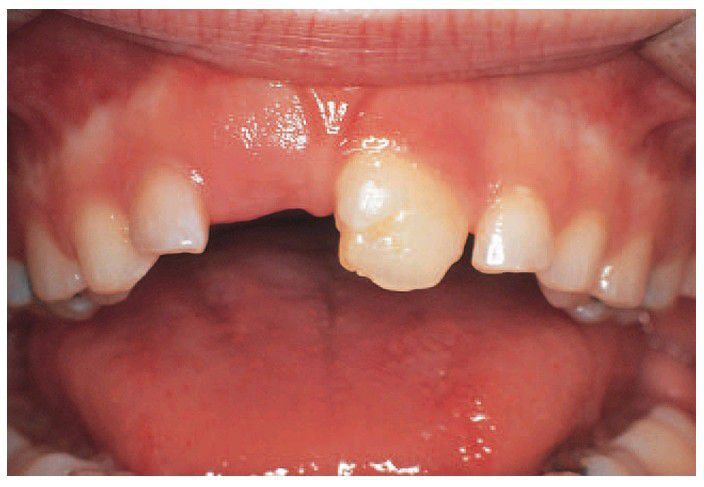 The upper left central incisor shows enamel pitting incisally and the upper right central incisor is deformed and has failed to erupt.