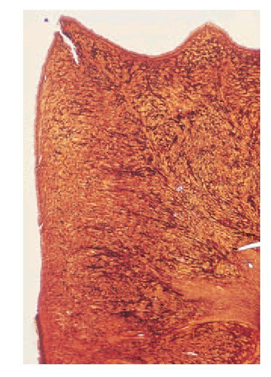 Microscopic appearance of dentinogenesis imperfecta showing the grossly disorganised tubular structure with inclusions of pulp in the dentine and obliteration of the pulp cavity.