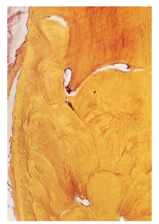 The pulp chamber in the short, broad root is obliterated by nodules of dentine.