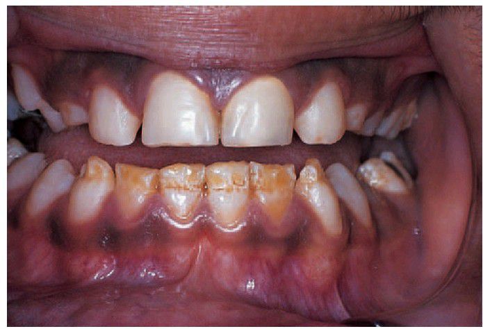 Chronological hypoplasia due to metabolic upset. Unlike the hereditary types of amelogenesis imperfecta, defects are linear and thought to correspond to a short period of amelogenesis disturbed by a concurrent severe illness.