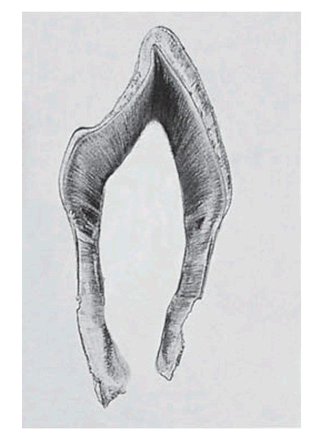 Tooth in hypophosphatasia showing the enlarged pulp chamber and absence of cementum.