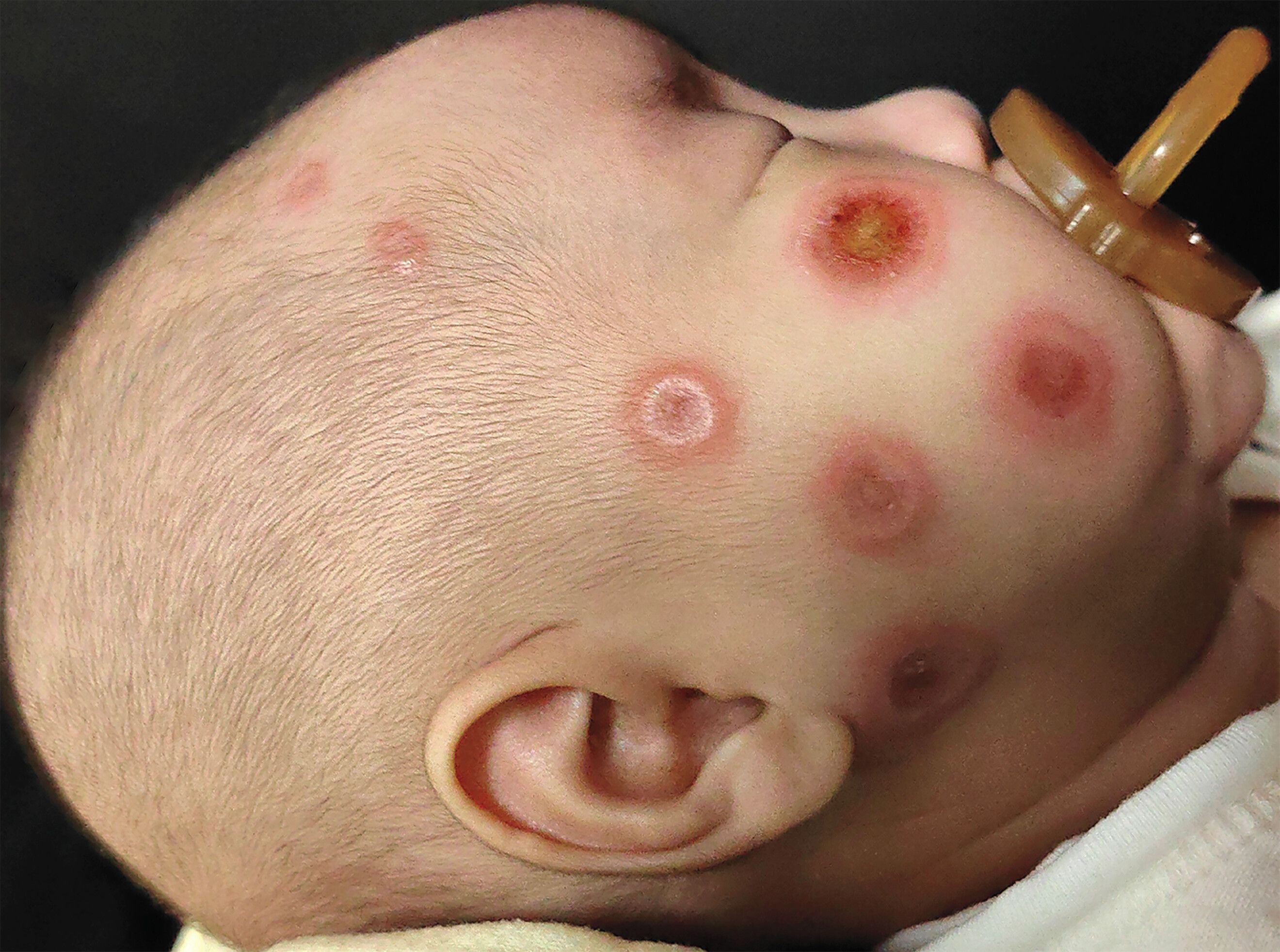 A previously healthy, full-term, 2-month-old boy was brought to the dermatology clinic with a 2-week history of red spots that had spread across his face. On physical examination, annular plaques with edematous borders and central crusting were observed on the baby’s face, scalp, and trunk. Results of a complete blood count and comprehensive metabolic panel were normal. Testing for syphilis was negative. Anti-Ro and anti-La antibodies were positive in both the infant and the mother, the latter of whom was asymptomatic and had no history of autoimmune disease. Examination of a skin-biopsy sample obtained from the baby’s right forehead showed vacuolar interface dermatitis and perivascular and periadnexal lymphocytic infiltrates. A diagnosis of neonatal lupus was made. Neonatal lupus results from the passive transfer of maternal anti-Ro and anti-La across the placenta. The associated rash may be present at birth but more often appears several weeks later, after the infant has been exposed to the sun. An electrocardiogram that was obtained to evaluate for atrioventricular block was normal. Reassurance was provided to the baby’s mother about the self-limited nature of the rash, and a recommendation was made for the use of photoprotection. Given her high risk for the development of autoimmune symptoms, the mother was referred to the rheumatology clinic. At the 2-month follow-up, the baby’s rash had resolved. source:nejm.org