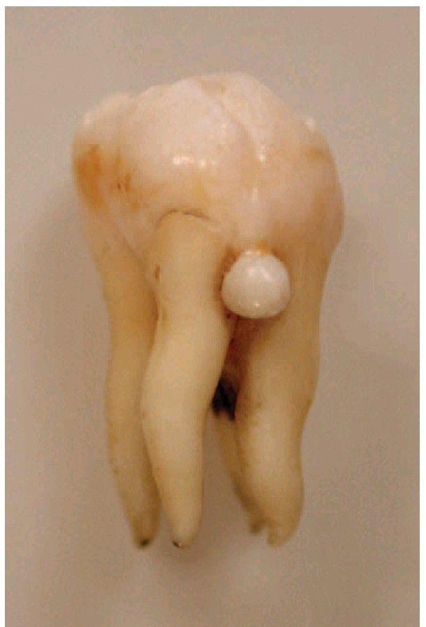 Enamel pearl associated with a spur of enamel joining the crown to the pearl.