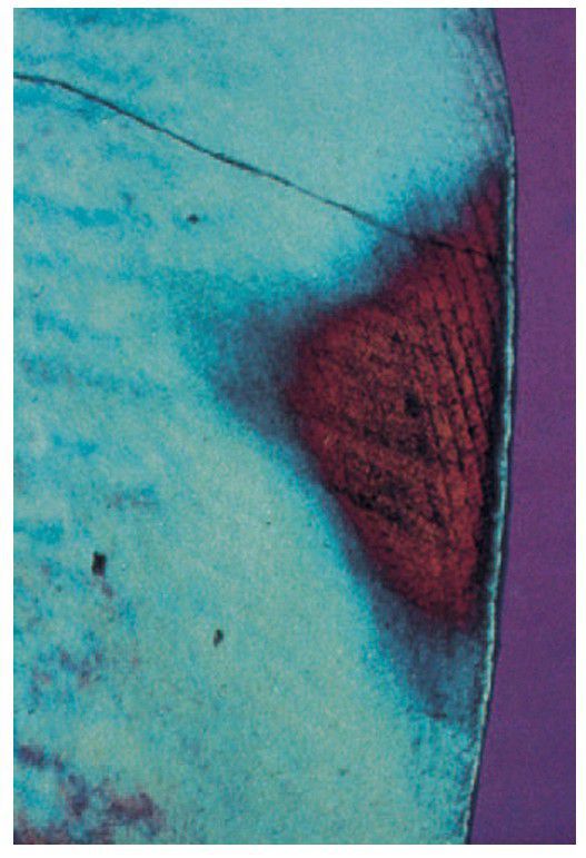 Ground section in water viewed by polarised light. The body of the lesion and the intact surface layer are visible. The translucent and dark zones are not seen until the section is viewed immersed in quinoline.