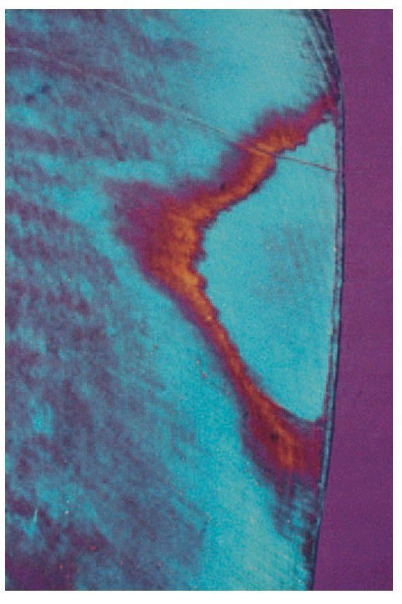 . Ground section viewed by polarised light after immersion in quinoline. Quinoline has fi lled the larger pores, causing most of the fi ne detail in the body of the lesion to disappear but the dark zone with its smaller pores is accentuated.