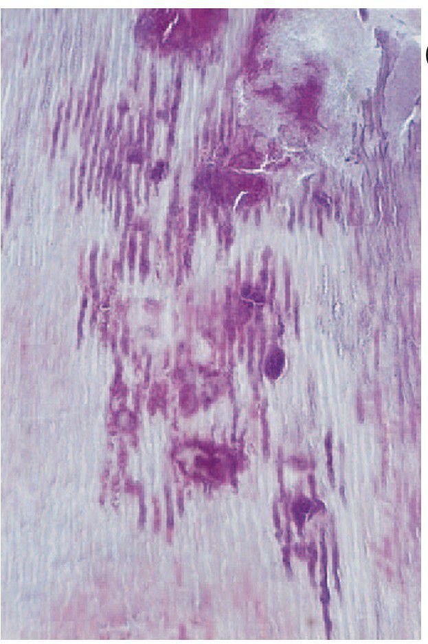 Caries of dentine. Infected tubules and fusiform masses of bacteria have expanded into the softened tissue. Adjacent tubules in the demineralised dentine have been bent and pushed aside by these masses.
