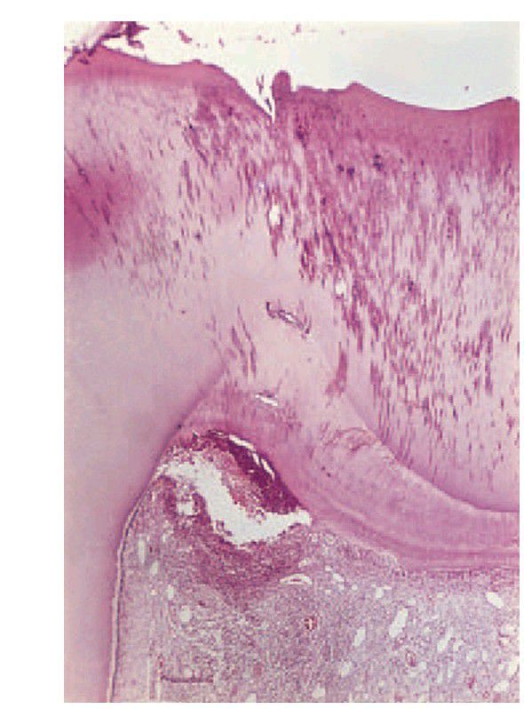 . Infection has penetrated the reactionary dentine causing infl ammation to spread down the pulp and pus to form in the corner