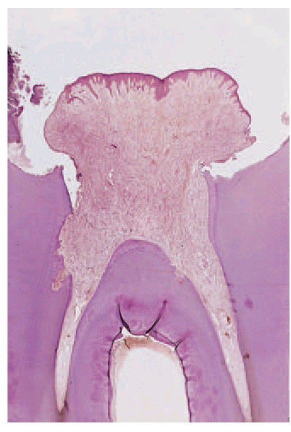 In this broken down molar, granulation tissue is proliferating from the pulp cavity and has acquired an epithelial covering over much of its surface. Note also the internal resorption (left) as a result of pulpal infl ammation.