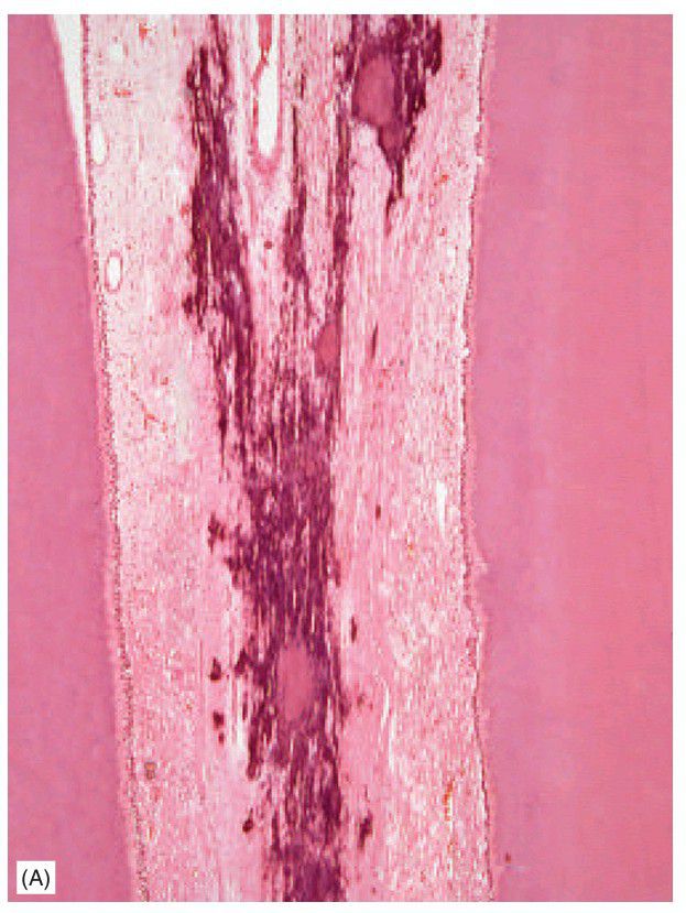 . (A) The dystrophic pulp mineralisations often found as an age change