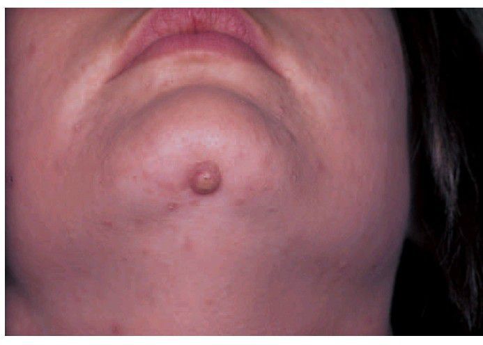 A persistent skin sinus from a lower incisor rendered non-vital by a blow some time previously. This young woman was seen and treated unsuccessfully for 2 years by her doctor, surgeons and dermatologists before anyone looked at her teeth.