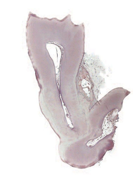 . Histological section of fused teeth reveals that the teeth are joined by cementum and not dentine