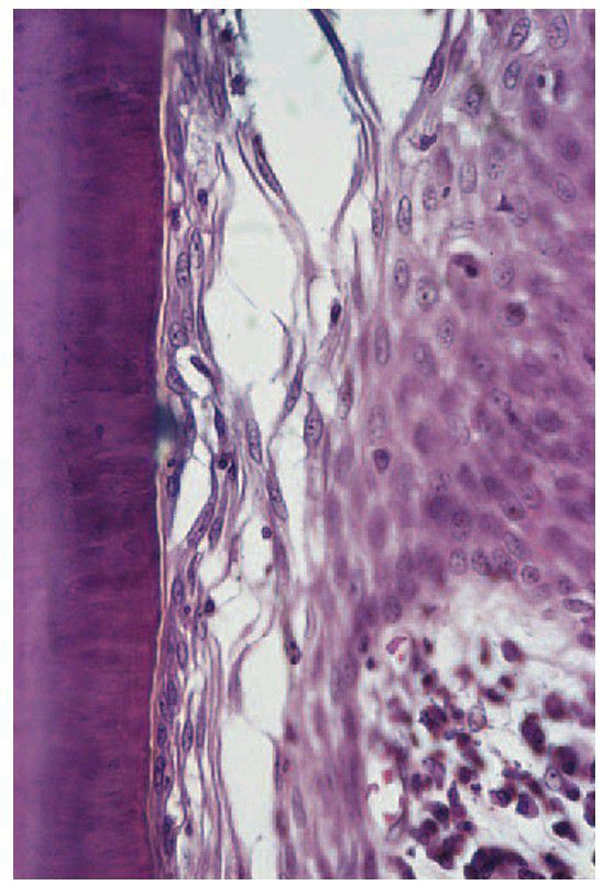 . On this tooth the epithelial attachment has migrated on to the surface of the cementum as a result of periodontal disease. The epithelium has been torn away from the tooth but the tear is within the junctional epithelium, leaving some of its cells still adherent to the cementum and attached by a clear cuticle. A similar strength is seen when the junctional epithelium is attached to enamel.