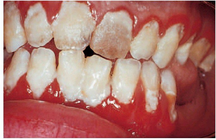. A fl orid, bright-red band of gingival infl ammation results from very poor oral hygiene. Thick accumulations of plaque are visible on all tooth surfaces.