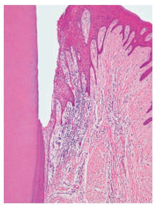. No pocket has yet formed but the epithelial attachment has extended on to the cementum and infl ammation has induced epithelial hyperplasia, as evidenced by rete hyperplasia.