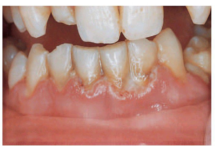 . The characteristic features of the lesion, the crater-shaped ulcers starting at the tips of the interdental papillae, are covered by a slough, as shown here.