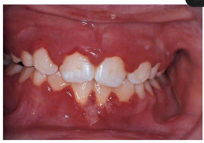 There is diffuse reddening of the attached gingiva with ulceration in the lower incisor region extending beyond the attached gingiva (see also Ch. 12).