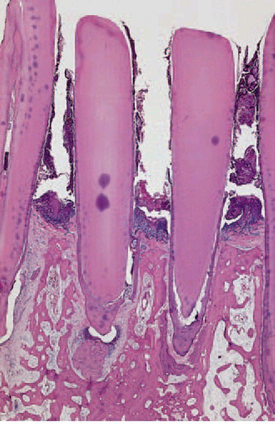 In this case, gingival destruction is almost as great as the degree of bone resorption so that excessively long clinical crowns have been produced. Supragingival calculus and a dense infl ammatory infi ltrate in the gingiva can be seen.