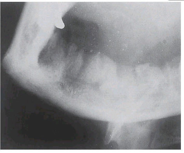 Osteomyelitis of the mandible following dental extractions. The outlines of the extraction sockets can be seen, together with dense sequestra of bone lying in a poorly circumscribed radiolucency.