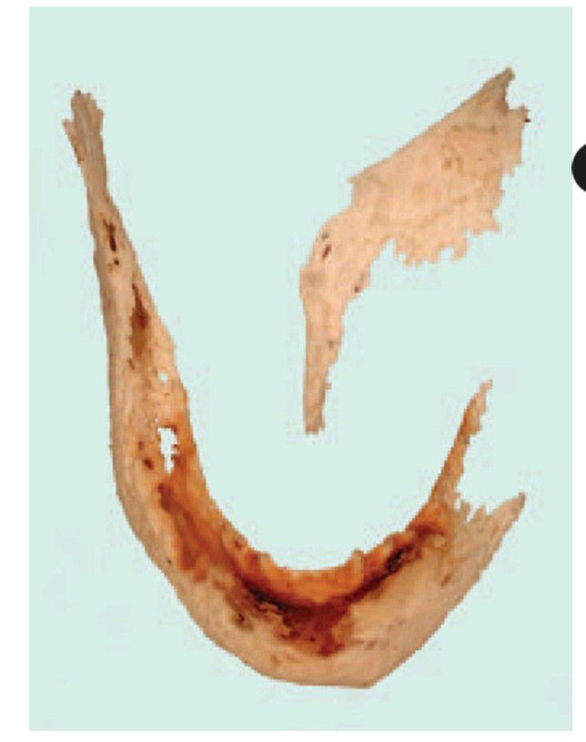 Sequestration of the entire mandible following chronic osteomyelitis of odontogenic origin.