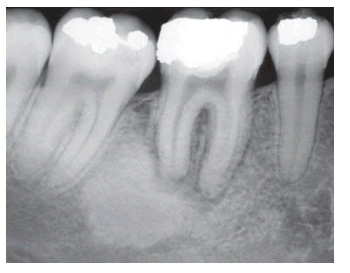 Sclerosing osteitis, a focal zone of sclerosis associated with periapical infl ammation from a non-vital lower fi rst molar.