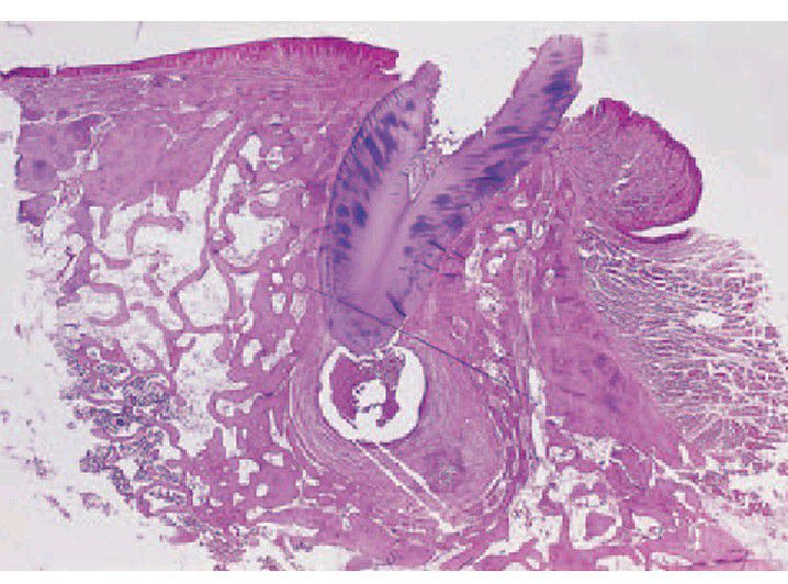 An epithelium-lined cavity has formed in this large periapical granuloma. There is a thick fi brous capsule infi ltrated by chronic infl ammatory cells. The alveolar bone has been resorbed and remodelled to accommodate the slowly expanding swelling.