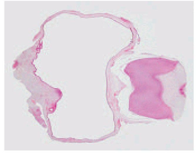 A cyst arising in the follicle of an unerupted tooth. Radiographically, the cyst might have appeared to be in a true dentigerous relationship with the crown. However, this is not a dentigerous cyst; its lining does not join the tooth at the amelocemental junction. A higher-power view would reveal that this is an odontogenic keratocyst.