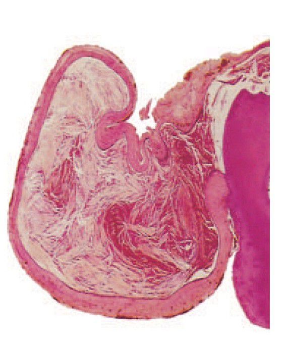 The cyst surrounds the crown of this molar and the wall is attached to its cementoenamel junction. There is a uniform, thin epithelial lining with minimal infl ammatory infi ltrate. Cholesterol clefts are numerous in the lumen, a result of the formation of cholesterol crystals in the wall.