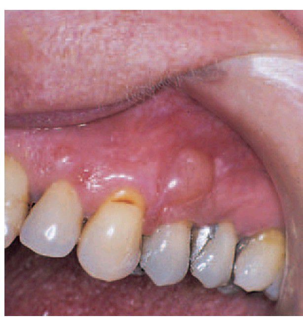 . Typical presentation as a superfi cial cyst in the attached gingiva of a premolar tooth.