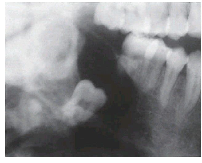 . This ameloblastoma forms a monolocular radiolucency enveloping the crown of an unerupted tooth. The radiological appearance mimics a dentigerous cyst, reinforcing the maxim that ameloblastoma should be considered in the differential diagnosis of every radiolucency at the angle of the mandible.