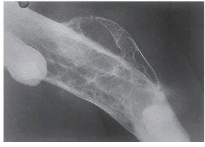 An occlusal view showing the fi nely trabeculated, honeycomb appearance and gross expansion of the mandible. Evidence of residual tumour was still present after 35 years in spite of vigorous treatment, both surgery and radiotherapy, in its earlier stages.