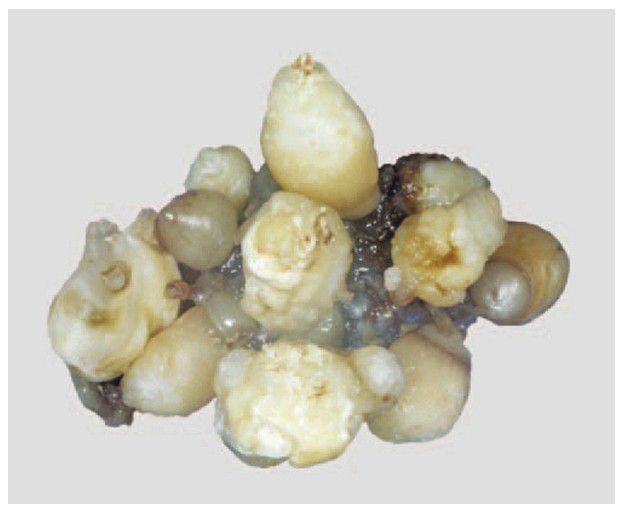Compound odontoma, a cluster of small deformed teeth or denticles.