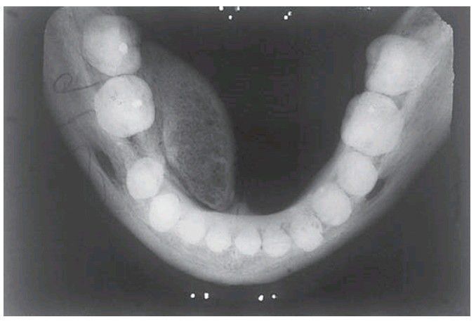 . The tumour has arisen from a relatively narrow base lingually to the molars but has been moulded forward during growth by pressure of the tongue. The trabecular pattern of cancellous bone can be seen. A torus mandibularis arises further forward on the jaw, arises from a broad base and is usually bilateral.
