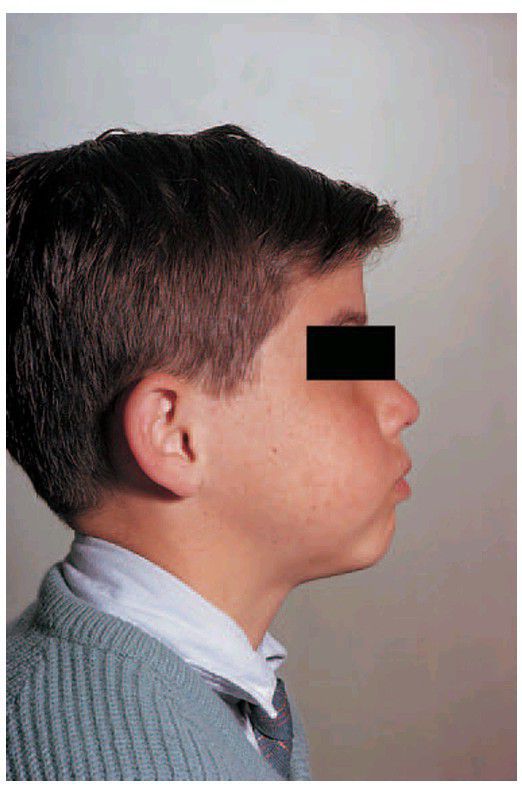 . The typical ‘cherubic’ bulging of the cheeks can be seen.