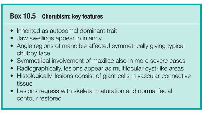 Cherubism causes multiple multilocular bone lesions in the mandible and maxilla that start in childhood, enlarge and then regress.